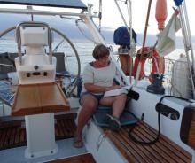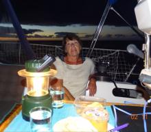Voici comment se déroulent 24 heures en mer. A minuit Philippe va se coucher et me réveille pour prendre mon quart. Selon, le temps et le besoin de surveillance, je lis sur ma liseuse, joue à des jeux sur la tablette ou regarde un film. A 3 heures changement de quart, je vais me coucher, Philippe a ls mêmes occupations pendant sa veille. A 6 heures nouveau changement, là je commence par me faire un petit café regarde ensuite le soleil se lever et vers 8h30, je prépare le petit déjeuner, et si Philippe se réveille à l’odeur du pain grillé nous déjeunons ensemble. Je refais un petit somme, Philippe fait la vaisselle. Vers 10 heures toilette de l’équipage dans la jupe ou le cockpit selon le temps. Ensuite lecture ou autres. Vers midi c ‘est l’heure d’allumer le téléphone satellite et l’ordinateur pour envoyer notre position quotidienne. Ensuite nous nous préparons une petite salade pour le repas, vaisselle, petit café et l’après-midi se passe en siestes, lectures, jeux, rédaction du blog. Je vous rassure, entre deux occupations, nous réglons les voiles et faisons le point ; c’est la moindre des choses ! Vers 18 heures nous commençons à regarder le soleil se coucher, à penser au repas du soir qui est chaud en général (hier risotto aux champignons et rôti de porc froid). Nous le prenons dans le cockpit à la lueur d’un lampe car il fait nuit. Vers 20 heures vaisselle, et en général, je vais me coucher et bouquine jusqu’à 21 heures pendant que Philippe commence son quart avec une heure d’avance.