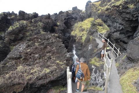 Notre visite se termine par la traversée de coulées de laves les plus récentes au nord. Elles ont formé en se refroidissant dans la mer : des grottes, des ponts, des trous béants où s’engouffrent les vagues.