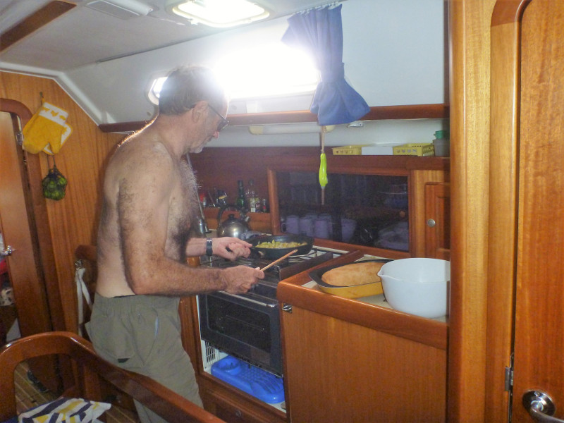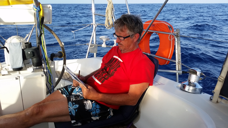 Le début de la traversée se fait vent de travers. Puis dans la première nuit, nous passons vent arrière avec un bon 25 nœuds. Nous avançons à quasiment huit nœuds. Mais cela ne dure pas. La dernière nuit et la dernière journée se font avec l'appui du moteur, avant que la manille qui relie le génois à la drisse ne se dévisse, nous enlevant le génois pour la fin du trajet.