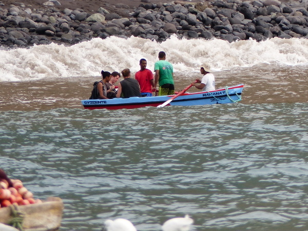 Finalement, on décide d'épargner Tania et surtout son ordinateur. Nous demandons l'aide des pêcheurs qui sont en train de rapatrier à terre un groupe de touristes partis faire une ballade en mer. Avec une petite barque savamment menée par un rameur, guidé par un complice depuis la plage, ils ramènent la précieuse cargaison en lieu sûr, dans des surfs éblouissants. Du grand Art ! Nous laissons Tania repartir vers Mindelo en « Aluguer » et nous essayons de nous inspirer de la technique pour repartir avec l'annexe. Clément trébuche dans les galets et tombe. Tant pis on ne l'attends pas. Il nous rejoindra à la nage.