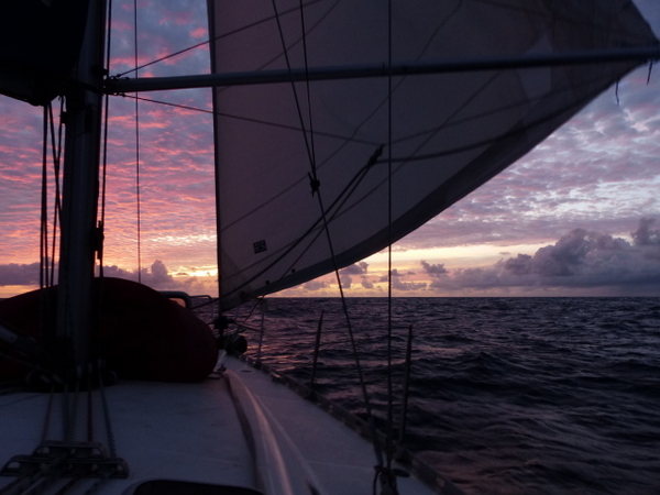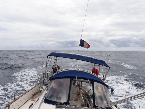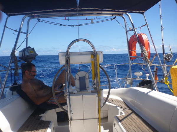 Nous sommes maintenant bien amarinés. Les journées passent finalement assez vite. Les batteries, qui avaient donné des signes de faiblesse tiennent le coup. On arrive à passer la nuit avec le pilote en faisant une demi heure de moteur toutes les trois heures. Le vent est régulier, autour de 15 nœuds, la mer est belle. Il n'y a pas de bateau en vue ou visible sur l'écran de l'AIS depuis plusieurs jours.