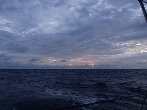 Cette météo perturbée s'est montrée bien clémente. Nous avons fait une traversée bien tranquille, et malgré le détour vers le sud, nous avons tenu notre petite moyenne de 5 nœuds.