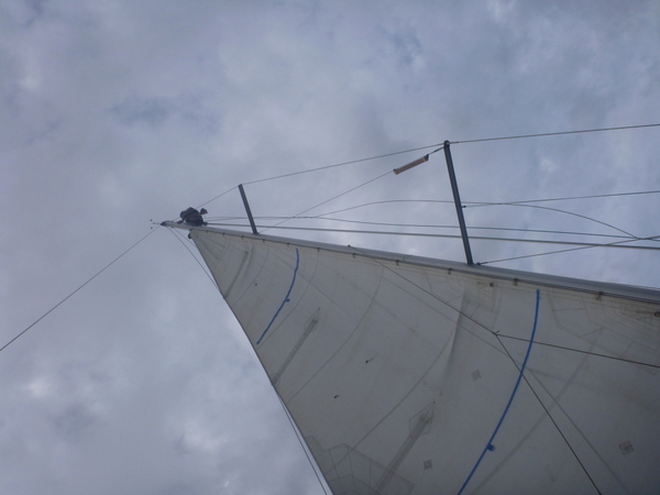 Mardi 17 janvier, au matin, Le génois s'est décroché et a commencé à passer dans l'eau. Heureusement, grâce à la vigilance de Raymond, il a pu le récupérer avec l'aide d'Alain avant qu'il ne passe trop sous le bateau. C'est une manille qui a lâché. C'est l'occasion pour Alain de réaliser un de ses rêves : enfin monter au mat au milieu de l'océan. En une heure tout est à nouveau en ordre de marche.