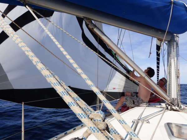 Cela fait deux jours que le vent oscille autour de 10 nœuds. Le spi est bien utile pour nous aider à avancer à une moyenne correcte.