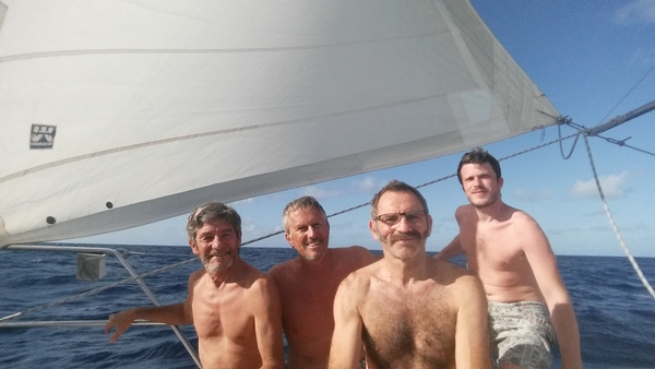Plus que 120 miles enfin, l'équivalent d'une petite traversée vers la Corse. Nous prenons la photo de l'équipage au complet à l'avant du bateau.