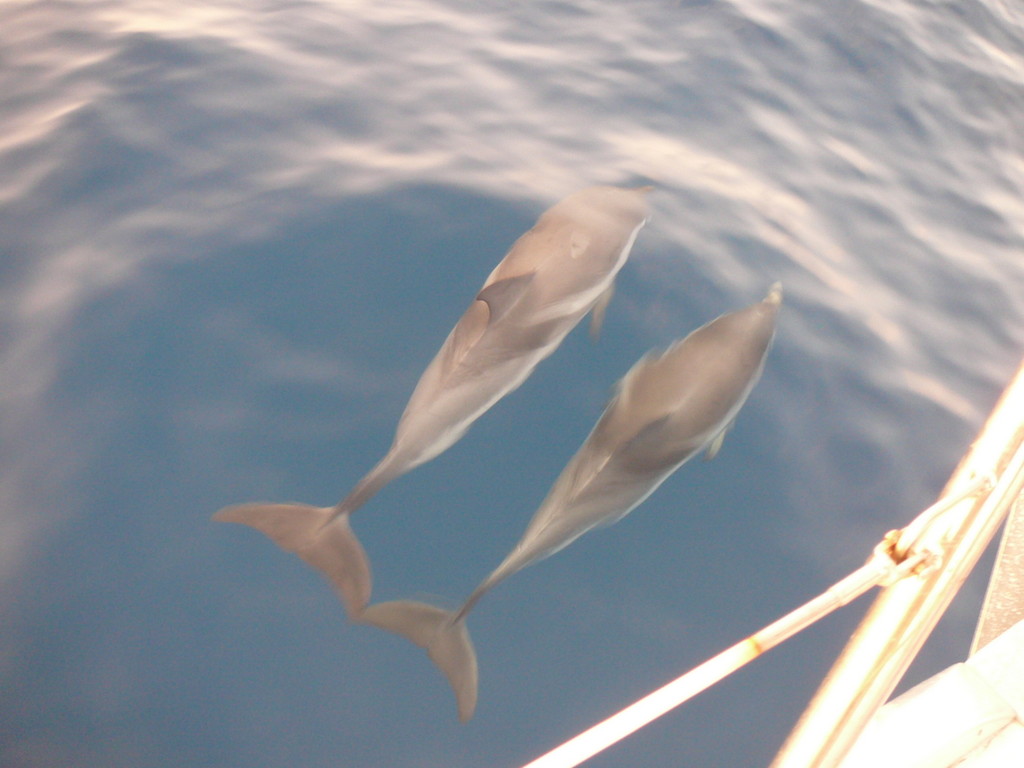 Pendant que nous dégustons notre repas, un choc dévie légèrement le bateau... alerte sur le pont. Ce sont trois dauphins bleu et blanc qui jouent dans l'étrave et qui ont dû la toucher. Nous les regardons un long moment, et nous doublons une tortue, qui va moins vite que le bateau et les dauphins (rien ne sert de nager, il faut partir à temps, fable célèbre de la tortue et du dauphin...). Vraiment pas facile de prendre un dauphin qui saute hors de l'eau en photo !
