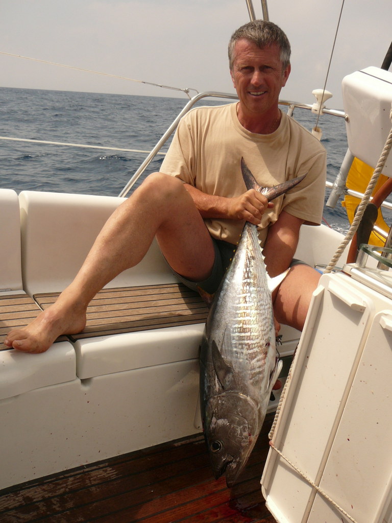 Au large, je mets les lignes à l'eau pour essayer les rapalas achetés à Malte et Favignana. A 6 nœuds, aucun ne tient. Je me contente donc de deux lignes avec deux vrais rapalas, marque déposée. J'en mets un sur la grosse canne, et un, directement sur une ligne, attachée au bateau avec un tendeur. C'est encore au moment où je me couche pour me reposer que Clément m'appelle. Le tendeur est tendu à bloc. Arrêt du moteur, (hé bien oui, nous sommes encore au moteur !), et je remonte doucement un beau petit thon qui doit peser entre 10 et 15 kilos.