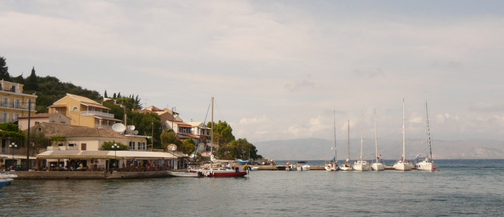 Changements vraiment surprenants en venant d'Italie. Le paysage, les constructions et même le mode de vie en bateau, tout a changé. Le plus marquant, ce sont les tavernas, tout autour du port de Kassiopi, juste au bord de l'eau. Ensuite, je ne comprends plus rien à ce qu'on me raconte.