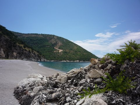 Après le vent fou des premiers jours, c'est désormais le calme plat question météo. C'est le moment d'explorer la côte, qui retrouve du relief aux confins du Monténégro : des criques invisibles de loin s'ouvrent devant l'étrave. Vers midi la tentation est trop forte, malgré un fond de gros blocs nous mouillons pour une baignade qui nous console de l'absence de vent. Faute ne n'avoir pu pêcher la moindre ablette, nous ne serons pas bredouilles : des grappes de moules (taille espagnole) s'accrochent aux rochers avec de gros coquillages. Un quart d'heure plus tard elles sont dans la casserole. Manque que le vin blanc! Les coquillages s'en sortent mieux ne sachant les préparer, ils repassent à l'eau.