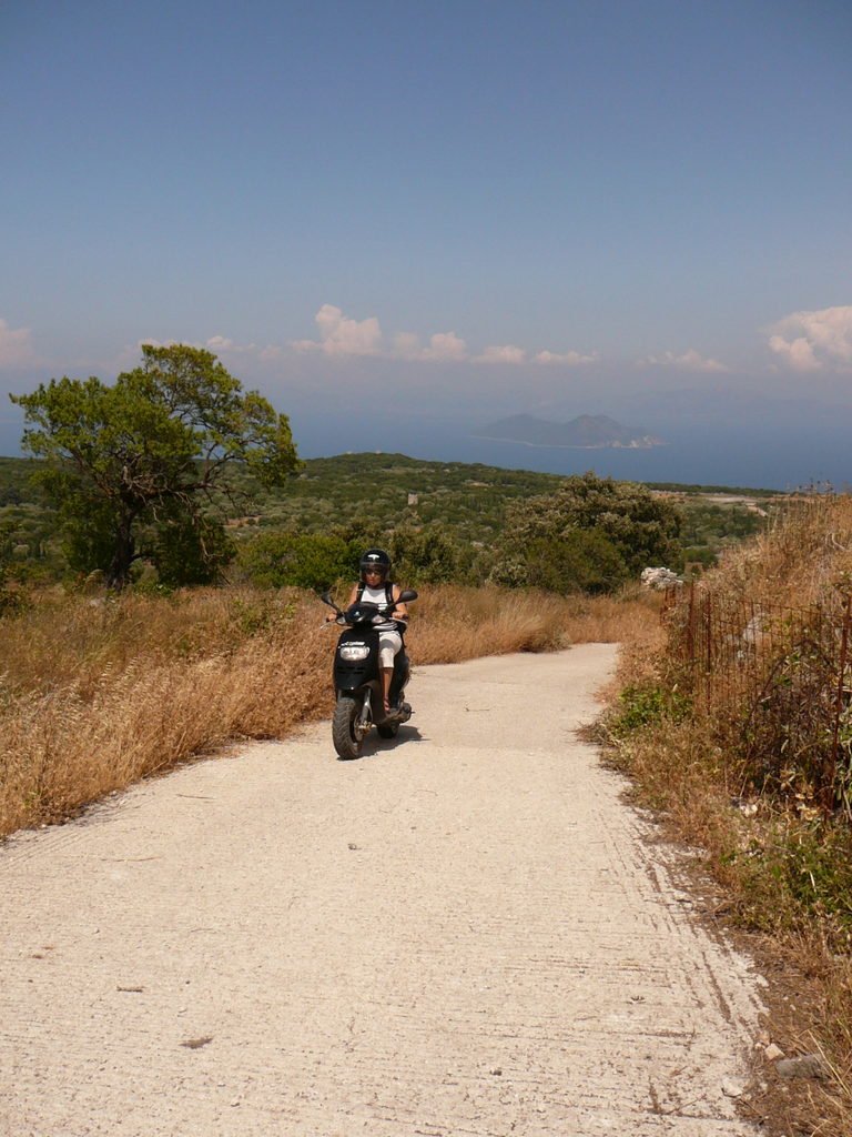 Sur les traces d’Ulysse, avec un casque digne de celui d’Hector! Pour la tenue moto, c’est à la mode grecque... Beaucoup de monde roule sans casque, l’amende prévue n’est que de 30 euro...