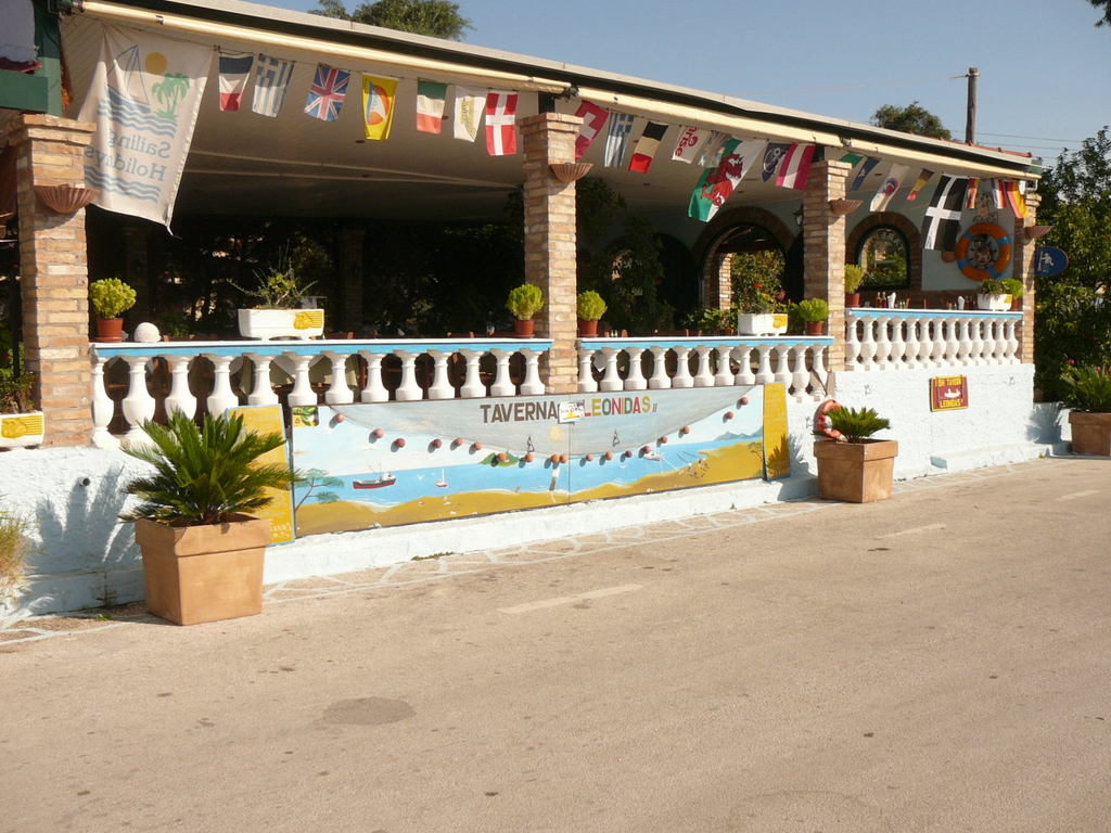 Le soir, nous mangeons à la Taverne Léonidas. C’est la seule sur ce quai, et le patron règle les problèmes des plaisanciers. C’est lui qui nous a trouvé la voiture de location pour un super prix. Il sert aussi d’interprète entre le mécano et le skipper d’un autre bateau français tombé en panne de moteur.