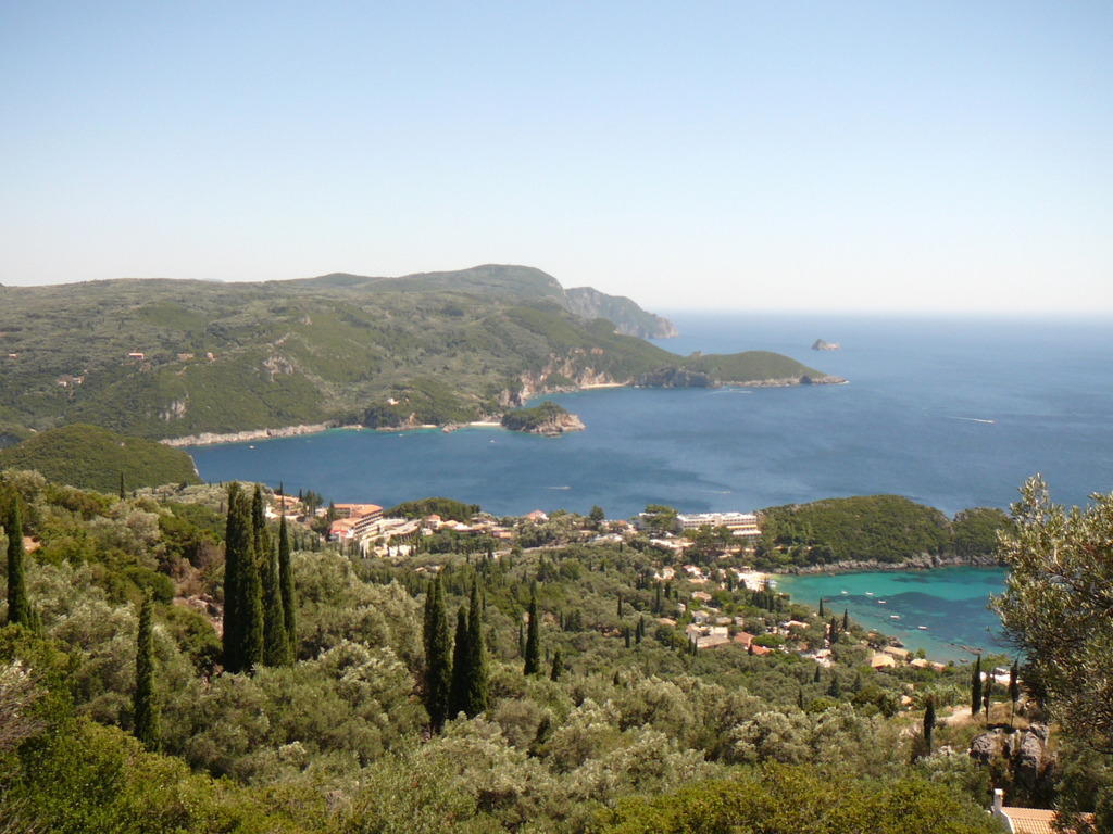 Comme des voleurs nous levons l'ancre avant la baston. Direction Palaiokastrita, sur la cote ouest de CORFOU. La traversée s'effectue sous génois seul (merci le vent du nord). Ce coin de l'île propose plusieurs mouillages magnifiques, mais le rivage est urbanisé, et tout dédié au tourisme (bateau à fonds de verre, pédalos, etc.). Bref, on ne s'y sent pas trop chez soi. Mais soyons justes les constructions s'intègrent relativement bien dans la végétation luxuriante (et oui la Grèce, ce n'est pas que des cailloux et la mer). On se demande comment ces paysages ne brûlent pas, on ne voit pas de traces d'incendie.