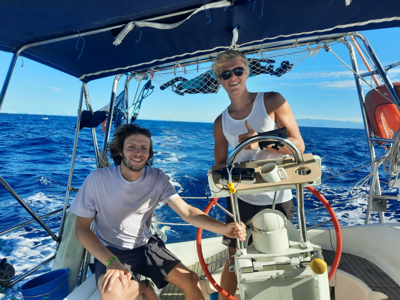 Nous les récupérons au petit matin sur le ponton de la Marina pour une bonne journée de navigation. Finalement, nous avons bien fait de les embarquer. Le pilote tombe à nouveau en panne et le pilote de secours lâche également.