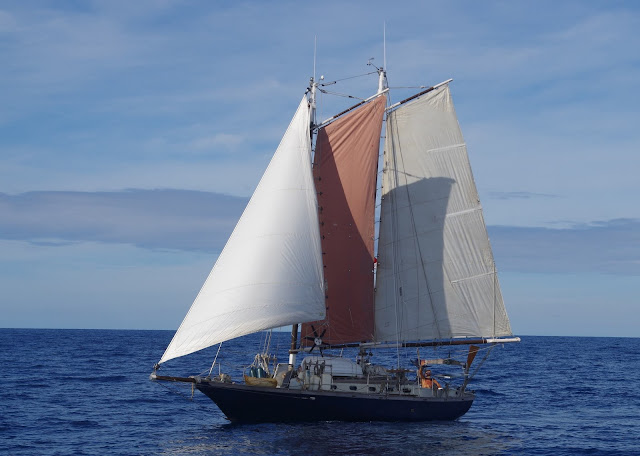 Catapultée même, la bonne fille, à 4 noeuds à sec de toile dans la mer de Corail, puis à 11, c'est beaucoup pour nous, dans le courant du détroit,...