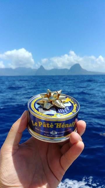 | Cette boite de prestigieux pâté de Pouldreuzic a été savourée en mer, devant les pitons de Sainte Lucie |