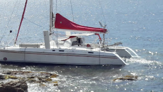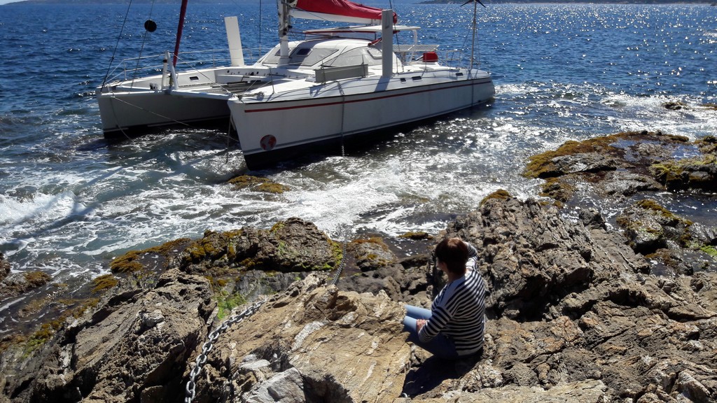 Armelle et moi vidons le bateau de tout ce qui peut être volé : électronique, outils, pièces et objets divers. Le transport sur les rochers recouverts d'eau est périlleux mais nous sortons une dizaine de sacs pleins.