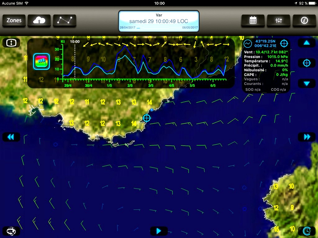 28 avril : heureusement il ne s'est rien passé après une nuit de fort mistral, rafales annoncées à 40 nœuds ; vent de terre, mer plate. Rien n'a bougé.