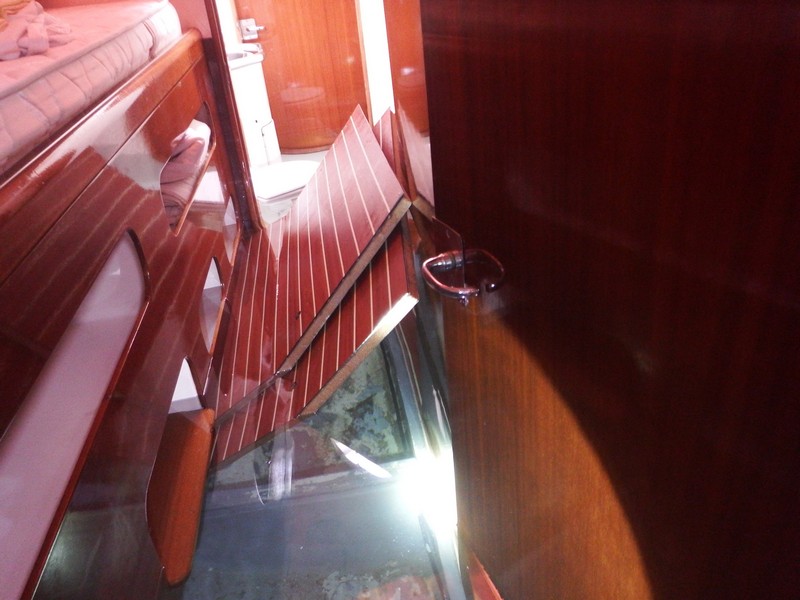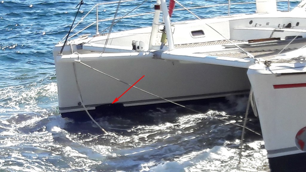 A l'intérieur, c'est inondé : voie d'eau sur les deux coques. On distingue une fissuration irrégulière sous l'eau.