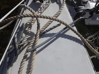 27 avril : retour sur le bateau pour récupérer les voiles d'avant que les plongeurs ont sorties pour avoir accès aux soutes, avec l'aide précieuse de nos voisins et amis Françoise et Dominique. Nous récupérons aussi l'ancre et quelques objets. A l'intérieur, les planchers sont mis hors d'eau et j'assure le génois en prévision du coup de vent prévu la nuit prochaine. Les moteurs sont sous l'eau...