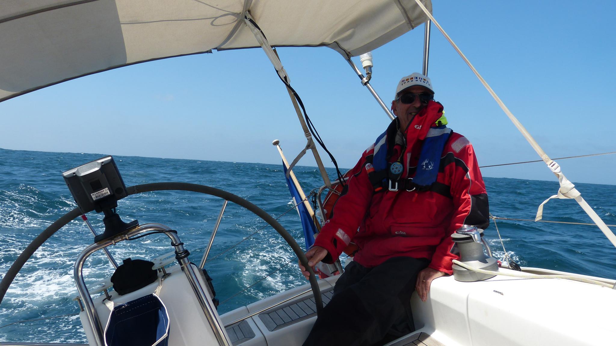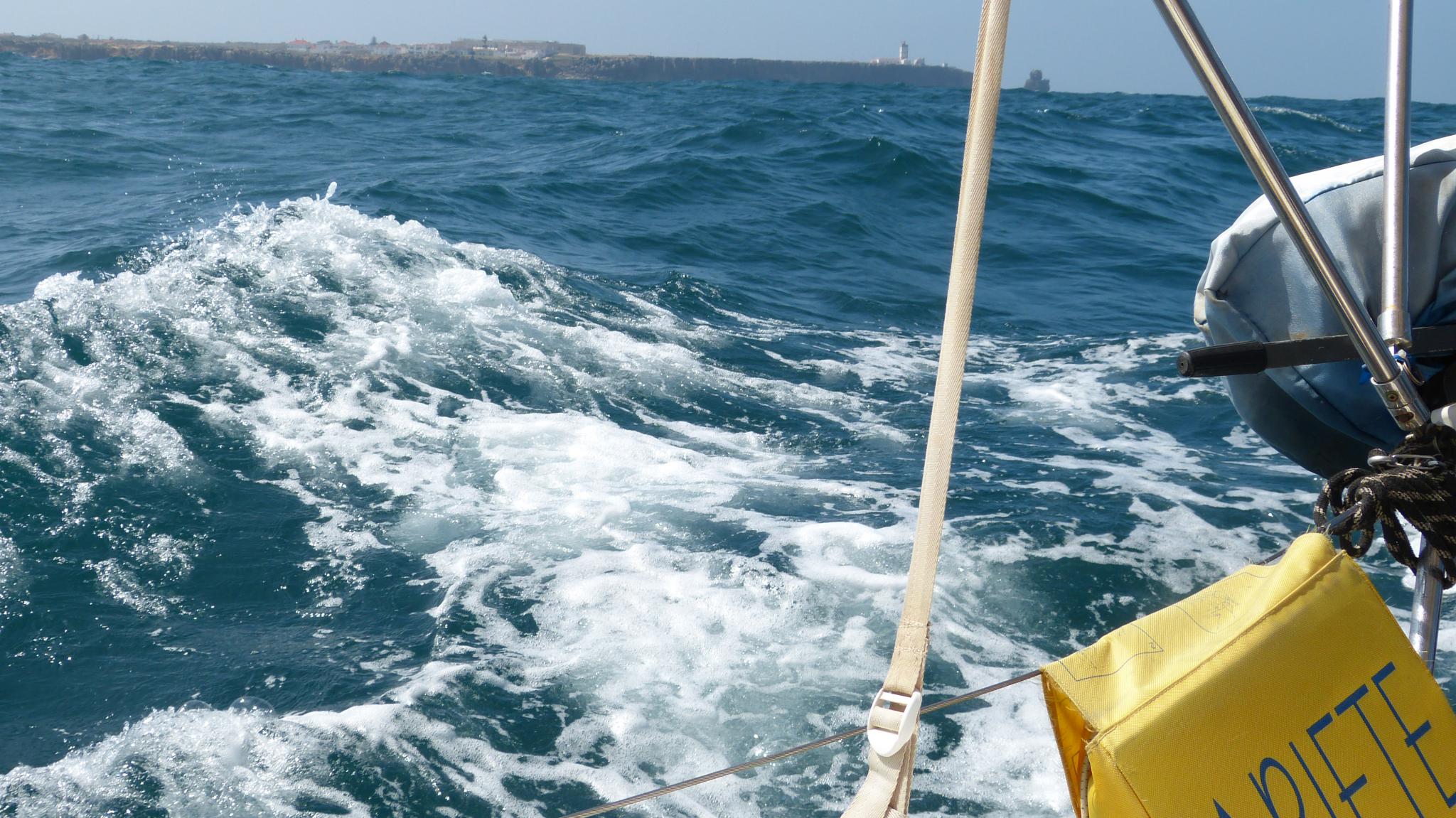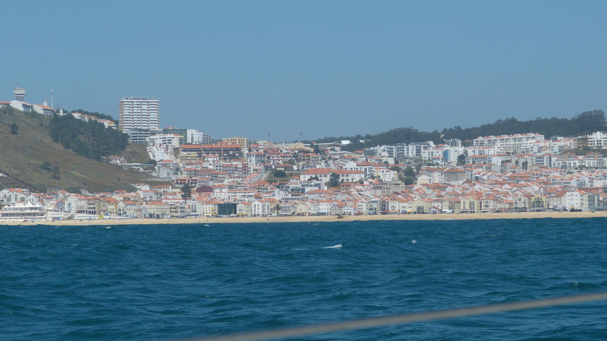 10h15, on passe la pointe de Peniche. La houle est de 2 à 3m, le soleil brille et les casiers parsèment la mer, tout va bien. Tenue de rigueur, ciré complet, veste et pantalon, bottes et ceinture de sécurité. Avec une vitesse, sous voile et 1 ris, de 6,5 à 7,5 nd, nous arrivons avant 15h dans la toute petite marina de Nazaré. Juste quelques pontons dans le fond, un peu au milieu de nulle part. Le responsable du port vient nous aider à prendre un catway. Pas de carte pour le ponton, le mécanisme est cassé, juste une clé pour les douches. Comme il ne travaille ni samedi ni dimanche, en partant il faudra gérér et payer avec la sécurité, à l'entrée du parking, un peu plus loin.