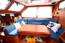 Equipement divers: +Générateur : Fischer Panda 6 kVa (environ 1700 heures) +Cuve a eau noire : 120 litres +Inverseur 12/220V : 500W +Guideau électrique 1000 watts avec commande au pied du guindeau ou depuis le cockpit ou depuis le poste de pilotage intérieur +Radar FURUNO 1623 de 2009 +GPS 32 FURUNO +Gestionnaire de batteries LINK PRO de 2009 +Chargeur de batteries : a remplacer +VHF NAVICOM RT 650 ASN/AIS de 2009 + VHF portable +Propulseur d’étrave de 6 CV (4 Kva) avec parc de batteries (2009) dédié au guindeau et au propulseur +Mat de charge pour moteur hors-bord +radeau de survie : BIP ZODIAC 8 personnes CLII, achat Novembre 2010 (a réviser) +Barre a roue a drosse (extérieure) + hydraulique (poste de pilotage intérieur). Vérin hydraulique de la meilleure qualité. Pilote automatique : hydraulique sur secteur de barre, partie électronique (ordinateur) Raymarine STX 30 installée en +Décembre 2009. Capteur d'angle de barre change en 2012. +grande échelle de bain sur la jupe, en teck et inox (pas d'acrobatie a faire pour entrer/sortir  de l'eau) +poste radio avec lecteur Cd, prise jack et USB. 4 enceintes dans le bateau + 2 enceintes déplaçables pouvant être utilisées a l’extérieur +Bimini, capote de descente +arceau inox de bonne facture avec 2 panneaux solaires de 140 Watts chacun (régulateurs MPPT) +Bossoirs inox surdimensionnés +Toiles bleues pour masquer par l’extérieur tous les hublots du carré, de la cuisine et de la cabine avant +Caches hublots en alcantara, doublé de tissu occultant pour fermer tous les hublots du bateau par l’intérieur +annexe CARIBE MVP11 (11 pieds ou 3,38 m.) avec fond en verre - achetée neuve en 2011. Prévoir l'achat d'un moteur hors-bord 10 ou 15 CV. +Presse étoupe Volvo de 2007 +douche de pont eau froide – eau chaude Voilure : +grand voile sur enrouleur +génois sur enrouleur +solent avec un ris (fabrication 2009, état comme neuf) +tourmentin rouge +étais largable avec ridoir Pelican pour solent et tourmentin (installé en 2009) +tangon pour spi ou génois Winchs : + Harken nombre 2, type 56.2 + Harken nombre 2, type 44.2 + Harken nombre 1, type 44 + Harken nombre 2, type 42 + Harken nombre 1, type 16 Cuisine : en U, beaucoup de rangements, grand plan de travail. Cuisinière a gaz (propane ou butane) 3 feux + four. Micro-onde. Frigo a ouverture latérale avec compartiment a glaçons + Frigo/congélateur (au choix) a ouverture verticale. Evier double. Pompes a pied : eau de mer, eau douce, vidange congélateur. Salles de bains: 2 salle de bains « en suite » avec les 2 chambres (+ouverture sur le carré pour la SDB avant). Chacune étant spacieuse, avec WC LAVAC, cabine de douche et évier séparés. 1 WC avec une évacuation au choix (cuve a eau noire ou mer), 1 WC branchée uniquement sur la cuve a eau noire (le passe coque est en place pour une sortie directe) Cabines: 1 grande cabine arrière avec un lit de 160*200, assises sur les cotes, et coiffeuse. 1 cabine avant Possibilité de transformer le salon du carre en grand lit 2 place 1 couchette de mer coté bâbord