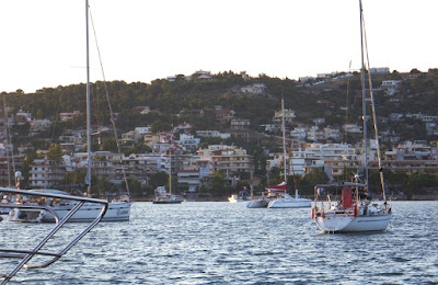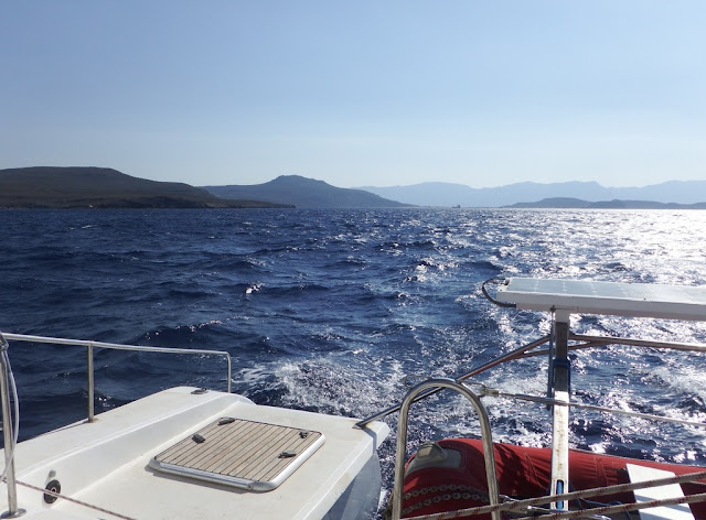 6 juillet : nous profitons du meltem pour descendre le long de la côte orientale et de l'île de Makronisi. Le vent est à 20 nœuds, nous marchons à 8,5 nœuds grand largue jusqu'à la traversée du Golfe Saronique. Puis nous sortons de la zone d'influence du meltem, le vent mollit, et nous marchons au moteur en fin d'après-midi.