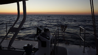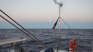 Nous traversons au moteur une bulle de haute pression de midi à 19h, puis nous retrouvons le vent de l'autre côté, d'ouest au travers-largue, et nous sommes sur la route de l'arrivée à 5-6 nœuds jusqu'à la fin de la nuit.