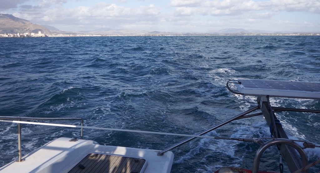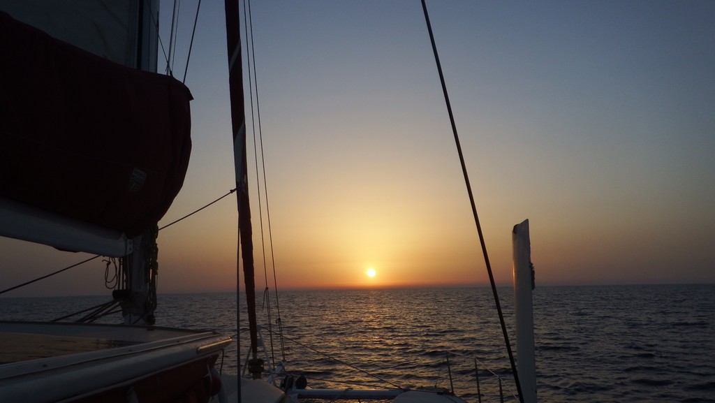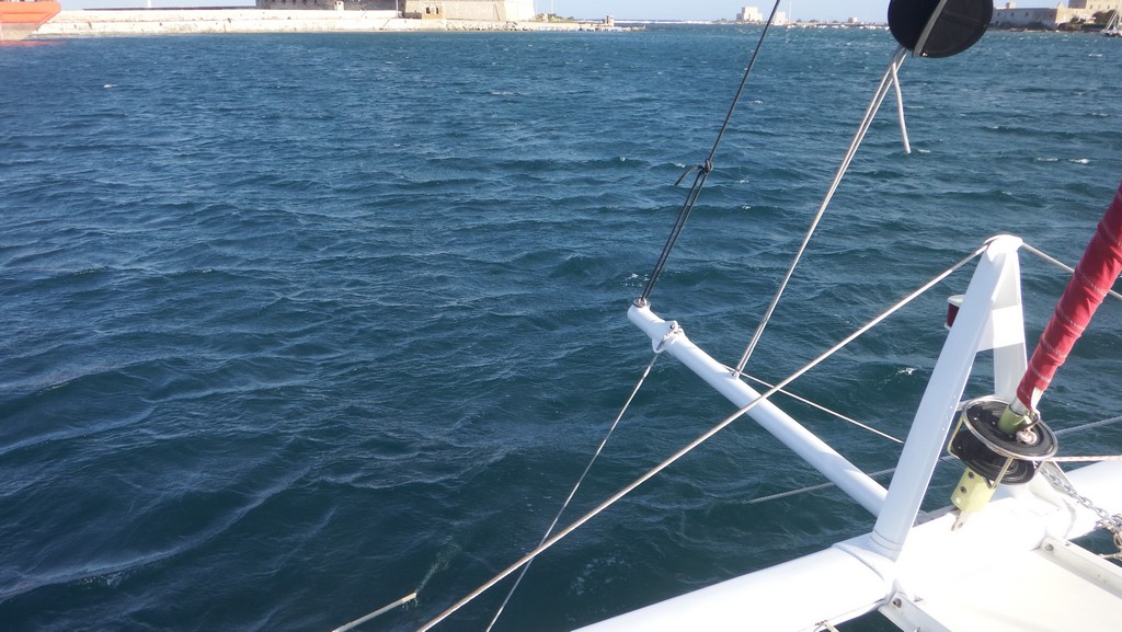 Nous entamons donc avec un léger retard la première longue étape de cette traversée, cap sur Malte. Nous marchons à 9 nœuds, réduction à un ris, 20 nœuds de vent au largue.