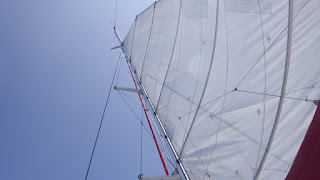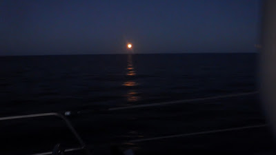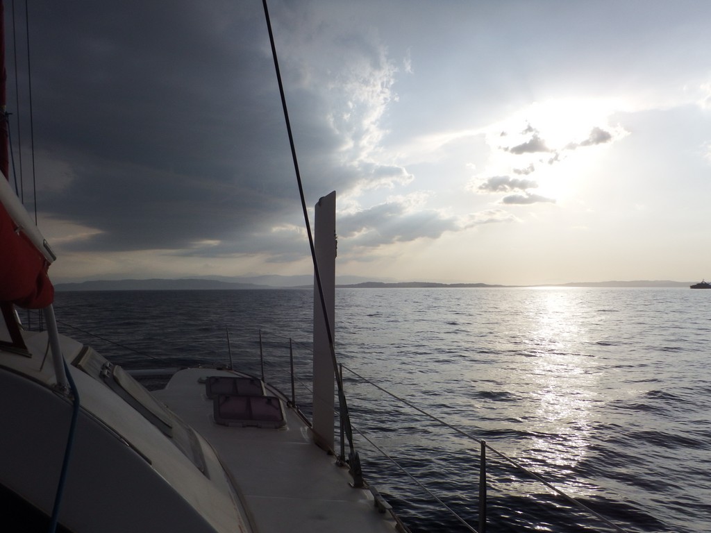 Par moments, un courant porteur nous aide. Vers 23 h, nous pouvons mettre sous voiles avec un vent d'ouest que nous prenons au bon plein, en réduisant même à un ris au milieu de la nuit.