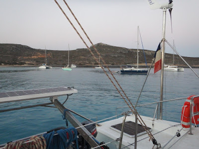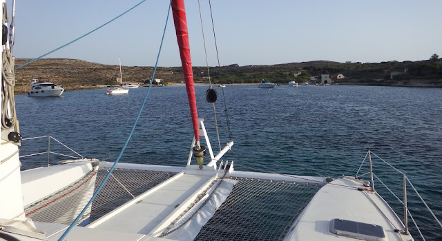 En fin d'après-midi nous quittons St Julian's pour remonter l'île de Malte en profitant d'un petit vent d'est. Nous atteignons en 2 heures la petite île de Comino, où nous mouillons dans la baie de Santa Maria en compagnie de 3 autres bateaux.