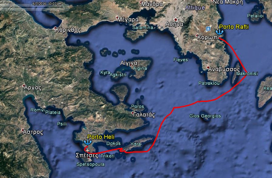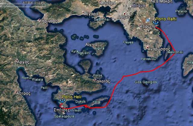 Nous cherchons un mouillage au sud d'Hydra, mais il y en a très peu et ils sont tous pleins. Nous poursuivons jusqu'à Porto Heli où le mouillage est assuré. Nous jetons l'ancre à l'est de la baie à la tombée de la nuit, par 3 m de fond de sable, concluant cette première étape de 83 milles.