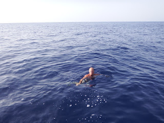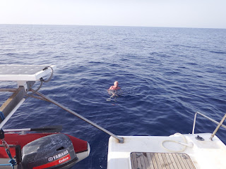 10 juillet : le vent tombe au lever du jour et à 6 h du matin nous remettons le moteur. Il fait chaud et nous nous octroyons une pause-baignade en fin d'après-midi.