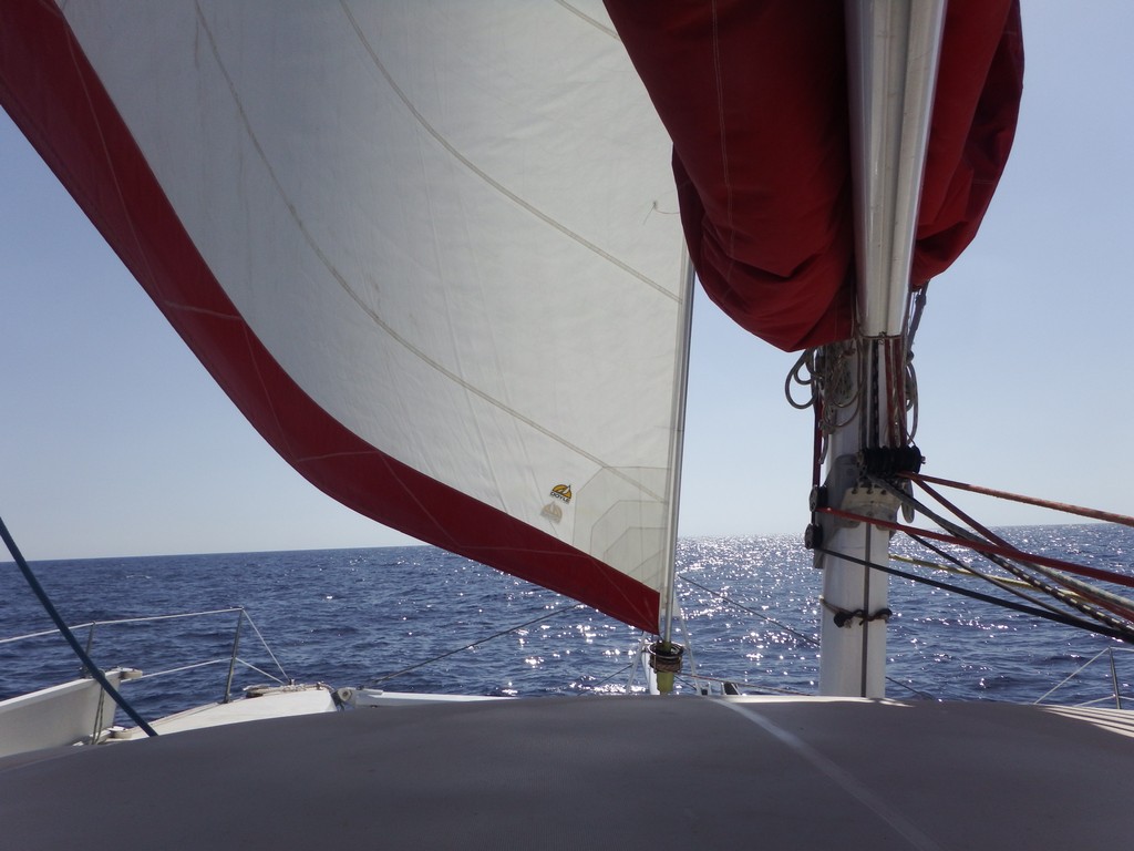 9 juillet : nous remettons sous voiles à 5 h du matin, au bon plein puis travers-largue avec un vent toujours modéré. Notre vitesse est stable à 8 nœuds toute la journée et toute la nuit suivante : un plaisir rare en méditerranée !