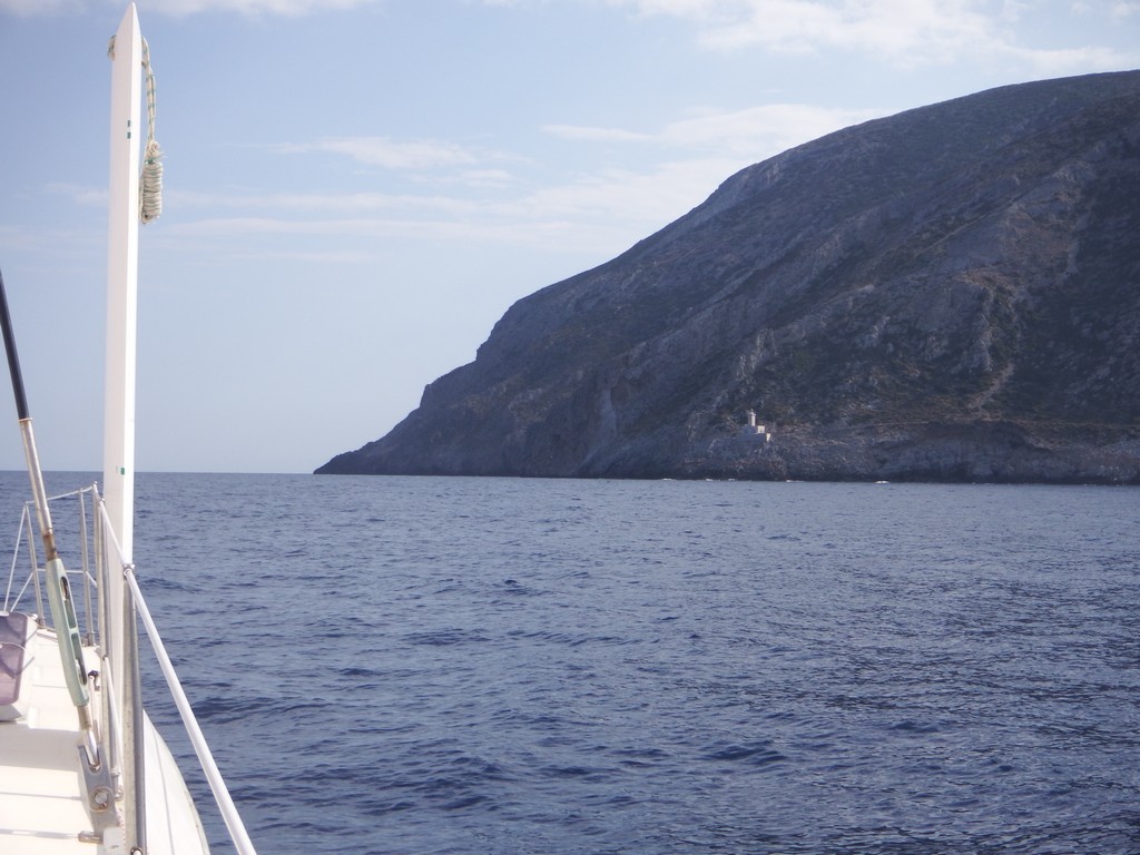 7 juillet : départ de Porto Heli à 7h15, route alternativement sous voiles et au moteur. Le vent d'ouest, puis d'est, ne dépasse pas 9 nœuds, avec un léger renforcement au cap Maleas.