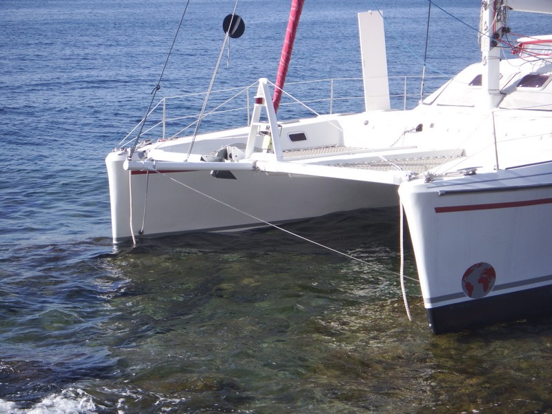 A l'intérieur, c'est inondé : voie d'eau sur les deux coques. On distingue une fissuration irrégulière sous l'eau.