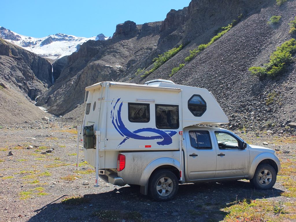 Le camper devant les montagnes du Cerro Castillo