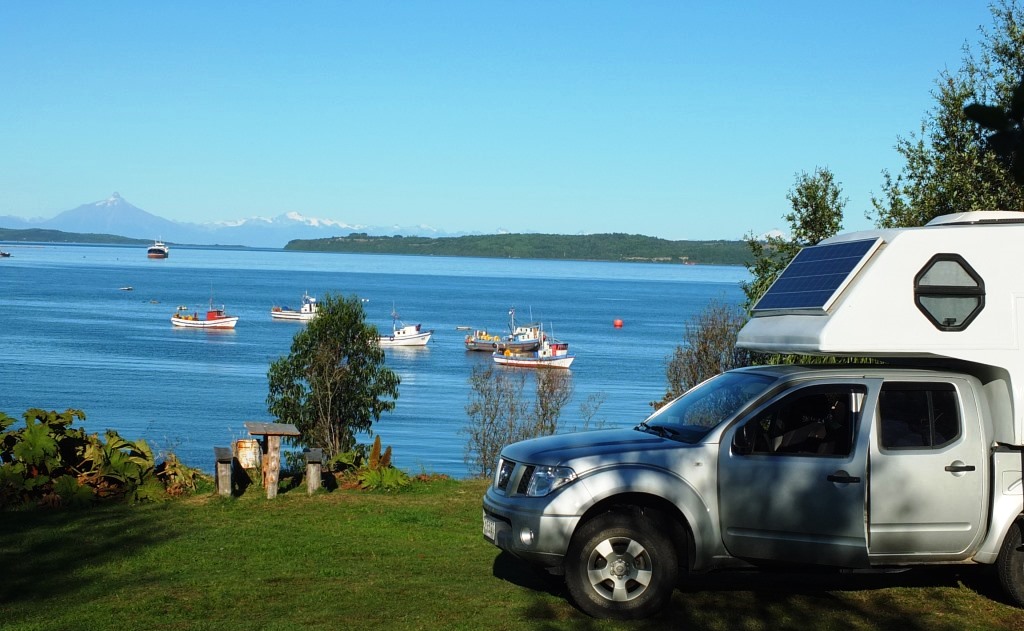 Au camping de Quellon, une belle vue sur la Cordillere des Andes, au loin le Corcovado, un important volcan au milieu du Parc de même nom...