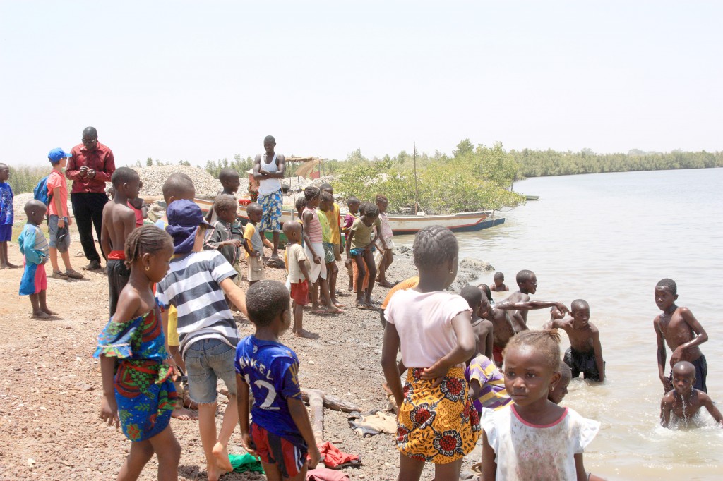 Après une visite à la très vieille mosquée du village – plus de trois cents ans, paraît-il – et une promenade jusqu'au fleuve sous un soleil de plomb toujours escortés d'innombrables enfants, nous voilà de retour avec un éclopé: un enfant du village s'est blessé au pied sur une coquille d'huître. Étonnant qu'il soit le seul: la cuisson et la vente de chair d'huîtres de palétuviers est l'une des activités les plus emblématique de cette région du pays, et, bien que les coquilles soient rassemblés en énormes tas pour être utilisées, après cuisson, dans la construction, de nombreuses coquilles gisent un peu partout, notamment près du débarcadère de fortune où les enfants se sont ébattus. La coupure, longue et profonde, sera soignée par Tanguy, avec les moyens du bord, ou plutôt de la trousse de premiers soins, car, s'il y a bien un dispensaire, il n'y a ni médecin, ni infirmière disponible.