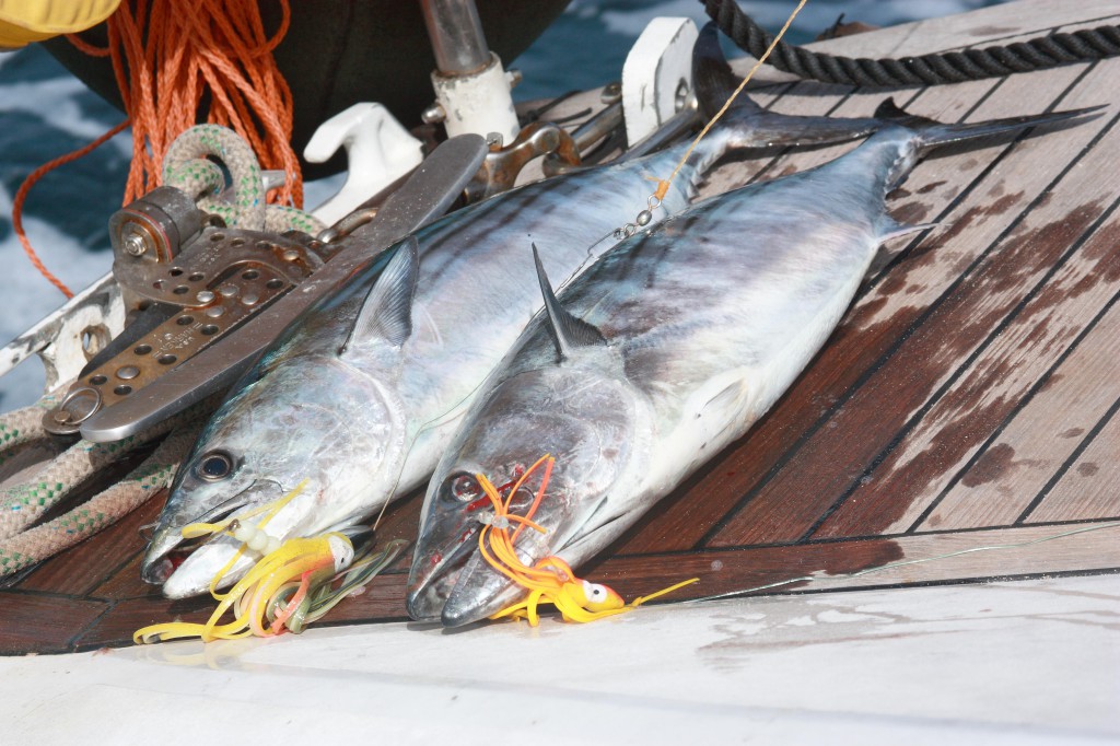 La mer perd de sa transparence pour devenir verte, puis brune. La houle disparaît, ne laissant plus qu'un vague clapot. Les oiseaux changent. La dernière journée sera marquée par deux événements majeurs: d'abord une nouvelle après-midi de spi – même si on en avait fait la veille, ça reste extraordinaire –, et puis surtout deux belles bonites rayées se sont invitées simultanément à notre bord, en se laissant tenter par les appâts que nous traînons depuis si longtemps! On finissait par désespérer, mais non, il fallait attendre patiemment d'avoir la chance de passer au bon endroit. La proximité du plateau continental a sans doute fait le reste...